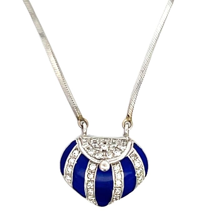 14K White Gold 0.32CTW Diamond & Blue Enamel Bag PendantProduct Family: Necklaces Metal Type: 14K White Gold Color: GH Clarity: SI2 Gram Weight: 7 Diamond Total Weight: 0.32 Gender: Women's