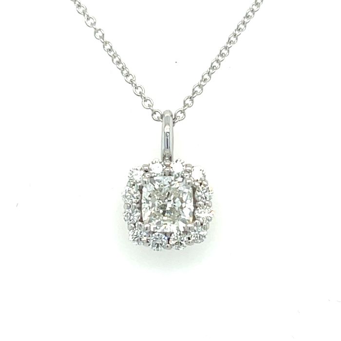 14K White Gold .94ctw Cushion Diamond Halo PendantProduct Family: Pendants Metal Type: 14K White Gold Color: G Clarity: VS2 Gram Weight: 2.5 Diamond Total Weight: 0.94 Gender: Women's