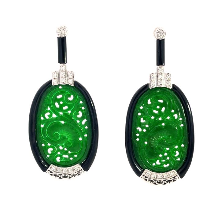 14K White Gold Black Onyx 5/8ctw Diamond Jade EarringsProduct Family: Earrings Metal Type: 14K White Gold Color: G Clarity: SI2 Gram Weight: 17.8 Diamond Total Weight: 0.65 Gender: Women's