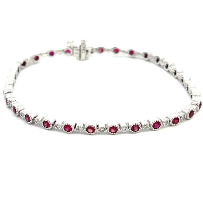 14K White Gold Bracelet with 0.41ctw Diamonds and 2.18ctw RubiesProduct Family: Bracelets Metal Type: 14K White Gold Color: GH Clarity: SI Gram Weight: 9.7 Diamond Total Weight: 0.41 Gem Stone Type: Ruby Gem Stone Weight: 2.18 Gender: Women's