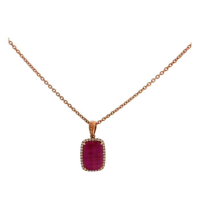 14K Rose Gold 4.00ctw Ruby and 0.17ctw Diamond PendantProduct Family: Pendants Metal Type: 14K Rose Gold Color: GH Clarity: VS Gram Weight: 4.67 Diamond Total Weight: 0.17 Gem Stone Type: Ruby Gender: Women's