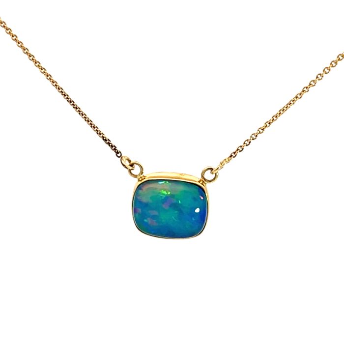 14K Yellow Gold Rectangular Ethiopian Opal NecklaceProduct Family: Necklaces Metal Type: 14K Yellow Gold Color: None Clarity: None Gram Weight: 3.31 Diamond Total Weight: 0 Gender: Women's
