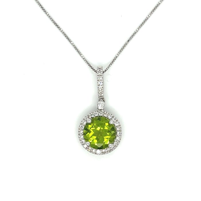 14K White Gold 1/6ctw Diamond and 1.72ct Peridot PendantProduct Family: Pendants Metal Type: 14K White Gold Color: GH Clarity: I2 Gram Weight: 3 Diamond Total Weight: 0.15 Gem Stone Type: Peridot Gem Stone Weight: 1.72 Gender: Women's