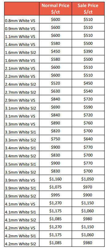 As the Holidays approach we are presenting our Melee Clearance Sale so you can access diamond production inventory for less and make more margin on seasonal sales. The sale ends on October 8th, so shop now and take advantage of the deals while stocks last! We have just added 3.3mm, 3.4mm, and 3.5mm in SI1 and SI2 to the sale.