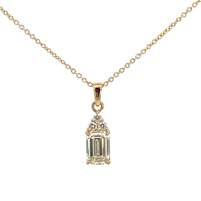 18K Yellow Gold GIA 1.12ct K VS2 Emerald 1236036742 and 0.09ctw Diamond PendantProduct Family: Pendants Metal Type: 18K Yellow Gold Color: K Clarity: VS2 Gram Weight: 2.6 Diamond Total Weight: 1.21 Stone 1: GIA 1236036742 Emerald 1.12ct KVS2 VGVG None GIA Report: VIEW Gender: Women's