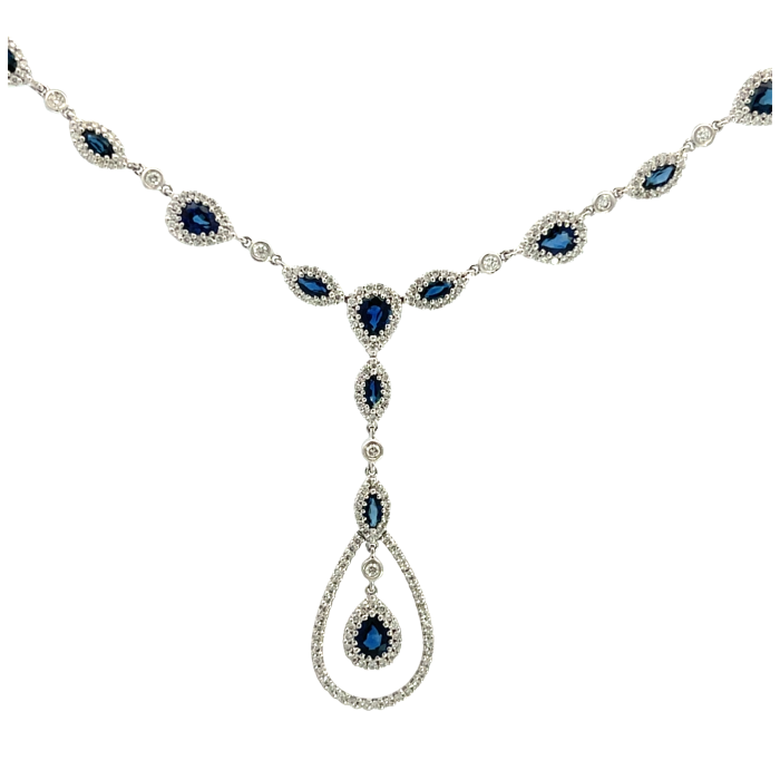 18K White Gold 2.47ctw Blue Sapphire and 1.80ctw Diamond NecklaceProduct Family: Necklaces Metal Type: 18K White Gold Color: GH Clarity: VS Gram Weight: 11.97 Diamond Total Weight: 1.8 Gem Stone Type: Sapphire Gender: Women's